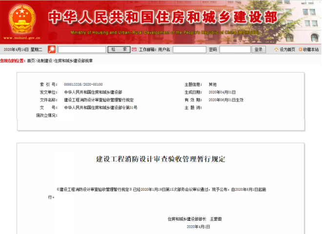 4月4日,中华人民共和国住房和城乡建设部网站发布《建设工程消防设计审查验收管理暂行规定》(中华人民共和国住房和城乡建设部令第51号),自2020年6月1日起施行。